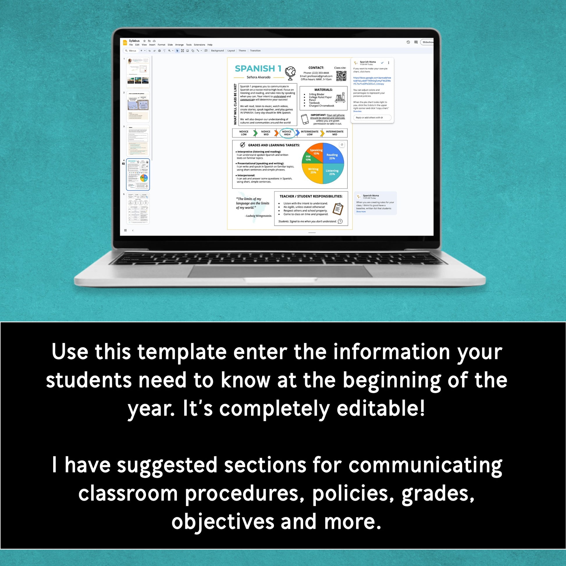 The syllabus template is 100% editable as Google slides, for you to customize with your personal or school-wide policies.
