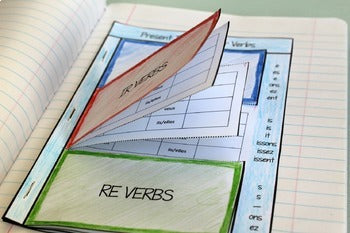 This verbs flapbook makes a perfect reference section for interactive notebooks. Three different sections (er, ir and re) contain six-part lift-up conjugation boxes, and the endings are listed separately as at-a-glance sections. You can use this when teaching verbs, creating reference sections, or reviewing certain tenses at the beginning of French 2. Students may also like to keep this handy when doing activities or playing games, to check their work.