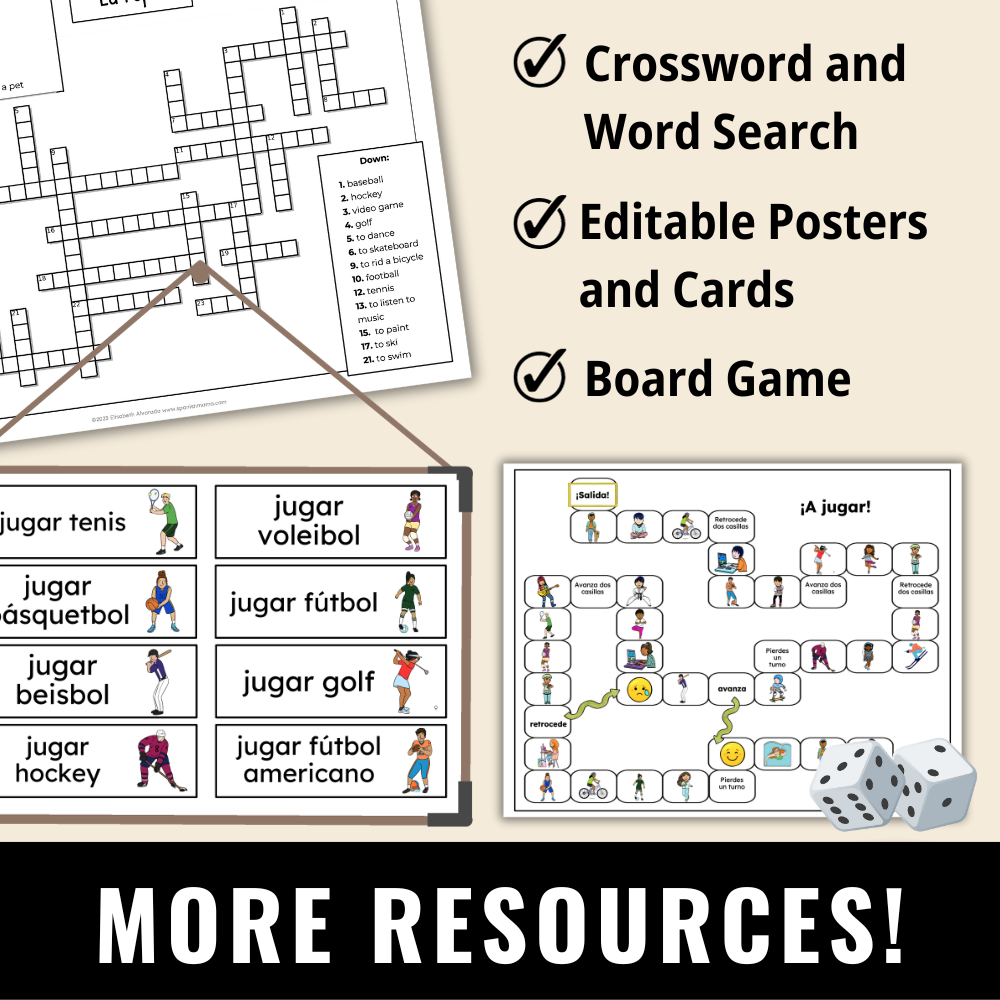 Sport and Hobbies Vocabulary Included: (Most pages have 100% editable text, except for the crossword puzzles and word searches. If you prefer to teach "jugar AL..." you can easily switch for that terminology.)